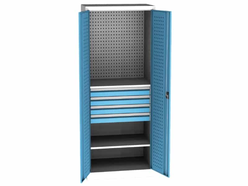 1. Armoire (SPD11D): H1950/950/600 mm, 2 étagères galvanisées et réglables par plage de 25 mm (portance 100 kg répartis), 4 tiroirs (100 100 100 100 mm) (portance 50 kg répartis), épaisseur en tôle des portes de 0,8 mm, serrure cylindrique, fermeture en deux points, portance 800 kg, portes pleines perforées afin d’y ajouter des crochets porte-outils. Cliquez Crochets porte-outils