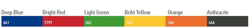 Bleu Profond (661), Rouge Vif (1797),  Vert Clair (362), Jaune Vif (123), Orange (166), Anthracite (446)