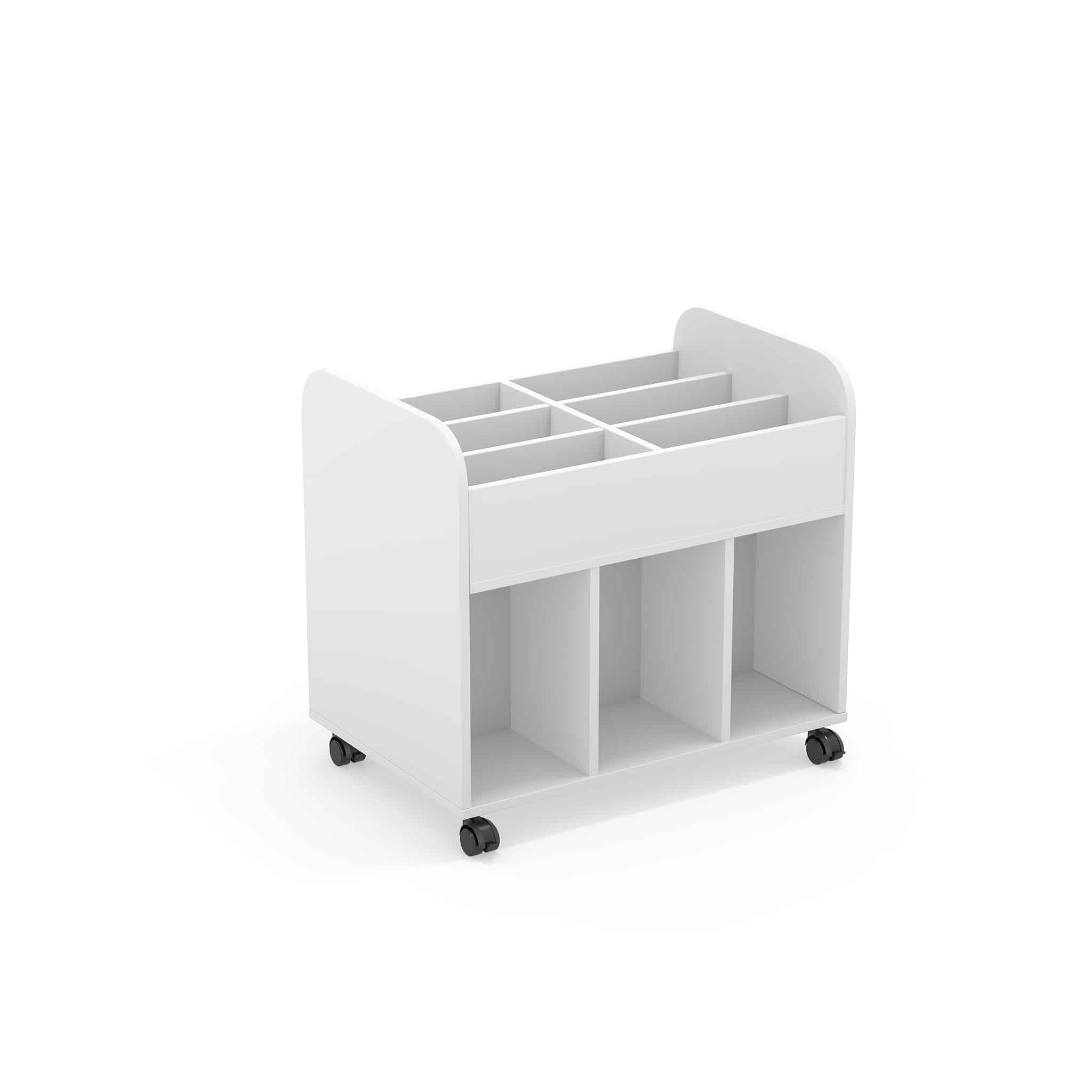 Chariot à livres avec 6 cases, double étagere et 3 compartiments. Coloris des panneaux latéraux au choix et roulettes avec freins. Meuble complémentaire pour crèches, maternelles, écoles primaires et bibliothèques.