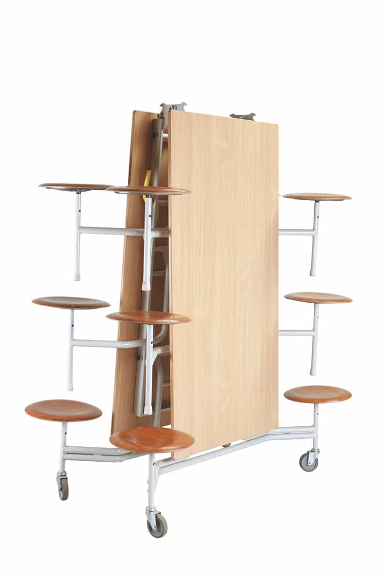 Largeurs de plateaux avec tabourets : 149 cm, plié et sur roulettes : 77 cm