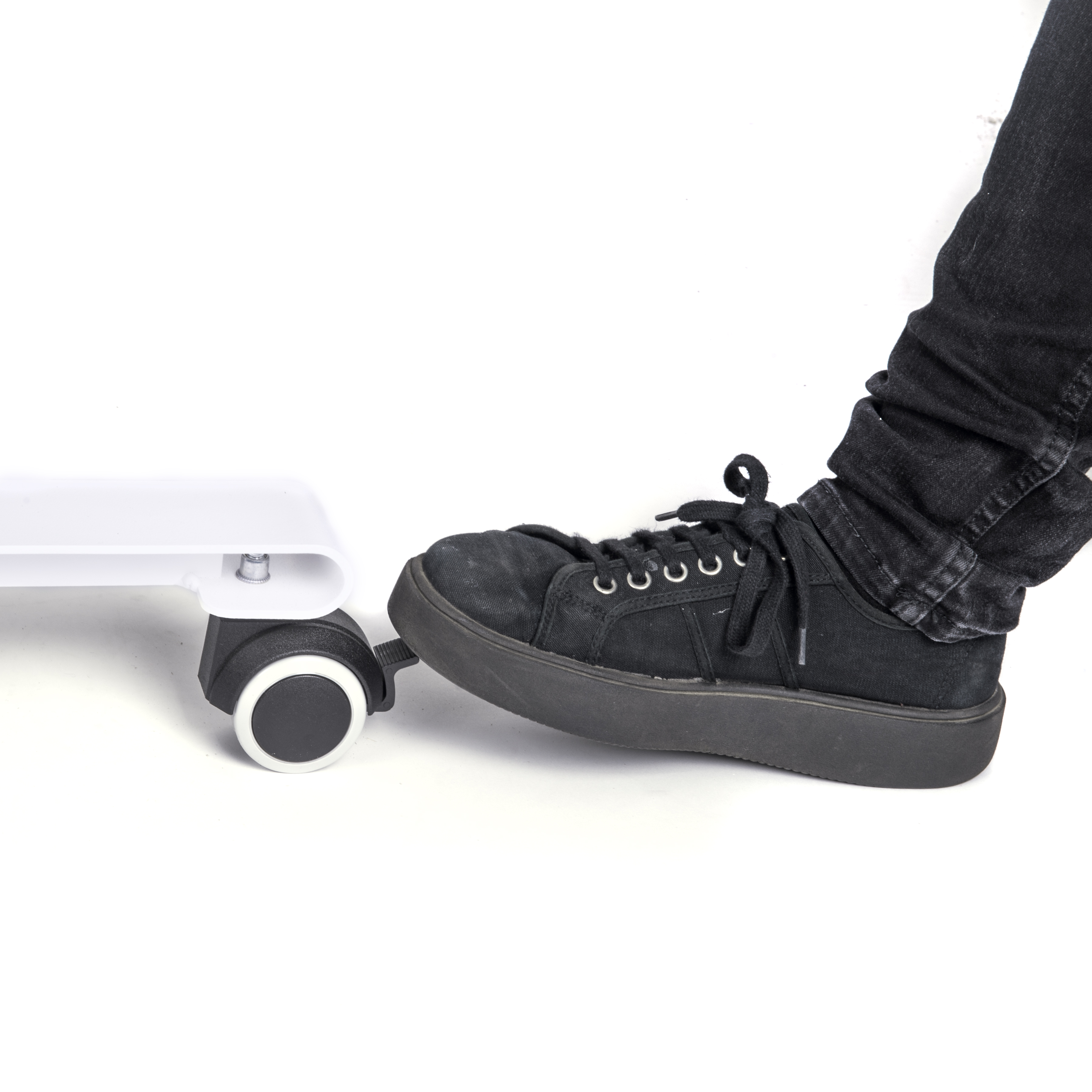 Pieds en forme “T” inversés, diamètre de 50 mm, 1.5 d’épaisseur, équipés de roulettes double galets, bloquables. Traverse en acier pour joindre deux pieds.